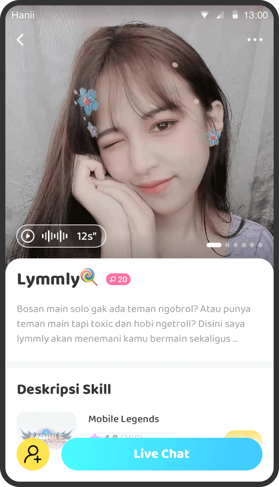 HALO! lymmly bisa menjadi teman mabar kamu sekaligus teman ngobrol yang asik dan pastinya tidak membosankan. Dengan posisi sebagai Mid support dan Offlaner siap menemani kamu bermain game MLBB